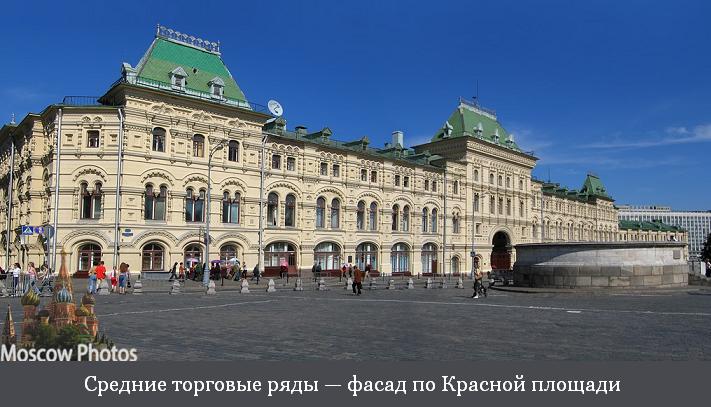 Если Верхние ряды торговали в розницу, то Средние - оптом. Собственно ряды, или внутренние проходы, носили имена: Медный, Москательный, Скобяной, Зеркальный, Фряжский (то есть винный)... В отличие от ГУМа в Средних рядах проходы не были перекрыты сверху и поэтому выглядели как переулки. Впрочем, последние 90 лет мало кто мог их видеть. Упраздненные в 1918 году, Средние ряды стали таинственным военным объектом. В частности, здесь был один из кабинетов Троцкого.